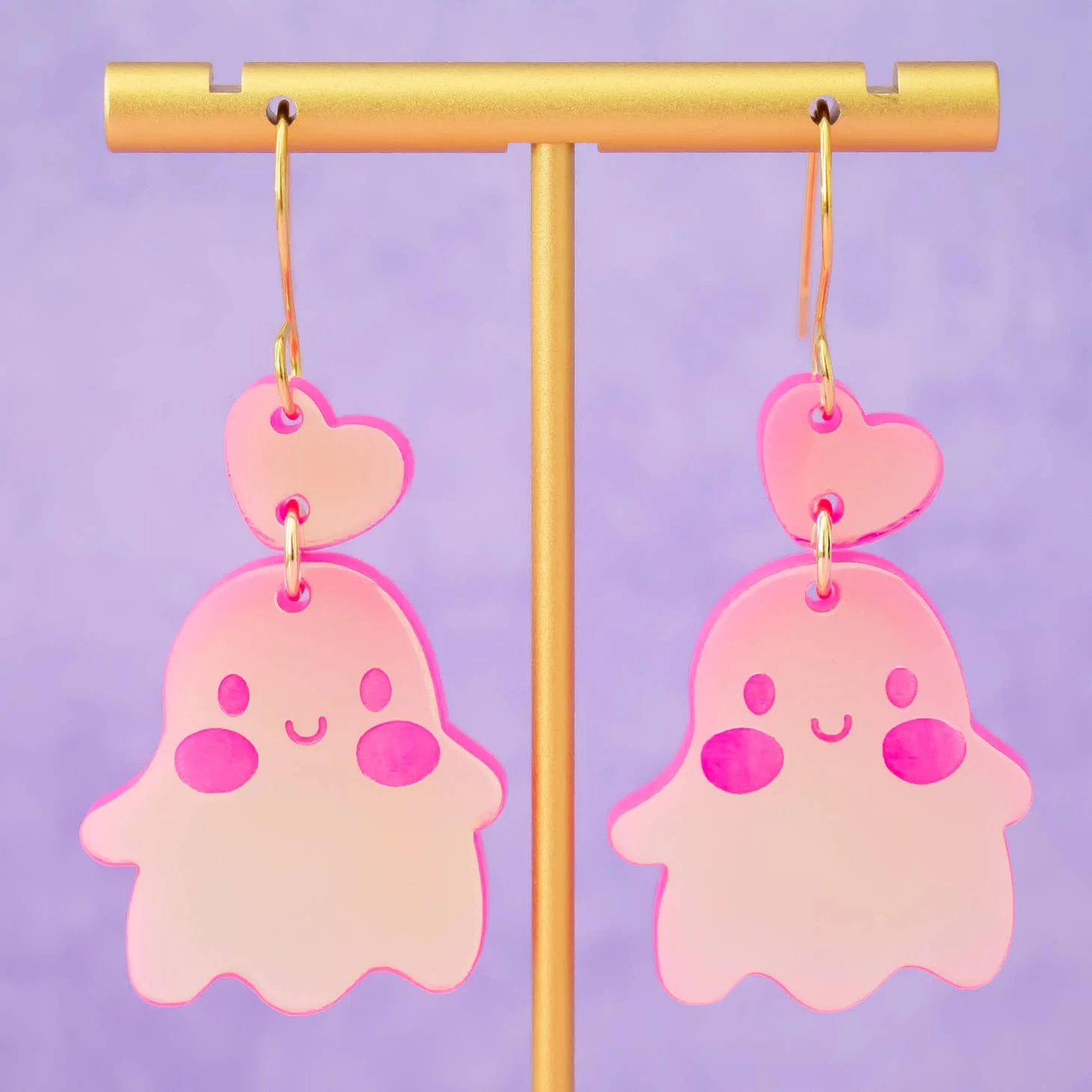 About: Cute ghost earrings in a lightweight acrylic so you can enjoy large, statement earrings comfortably all day. Comes in either white or iridescent pink